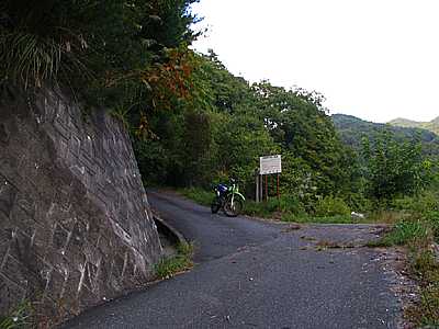 | 午後3時23分 最初はT字路を右へと行ってみた。 数100mほど進んだ地点からは殆ど廃道状態。 その先は路面から木々の生えた道が一気の下り坂となって名無しへと落ち込んでいく。 転倒覚悟なら抜けられそうだが素直に引き返す。 |
