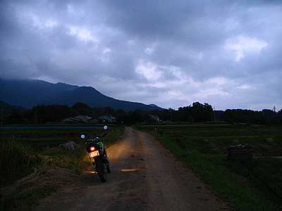 午後5時47分 不明の道。 何処へ続くのか分からない未舗装路が山へと向かっている。 |