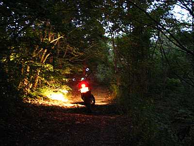 | 午後5時55分 抜けられるのか? 道幅は1.5車線弱ほどあるのだが、廻りは頭上まで木々が覆っている。暗さと背丈もある草で先の道が読めず、いきなり道が途切れていたら厄介だ。 |