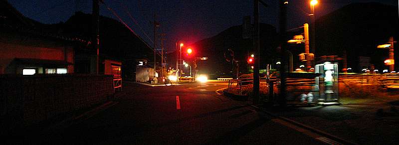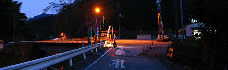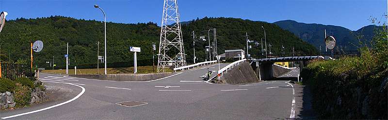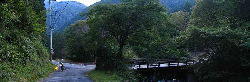 | 17時40分 県道802号の徳間バス停↑で左折して石合橋→へ。 写真では明るく見えるが、実際にはすっかり暗くなっている。 ちなみにこの石合橋を右折すると県道801号となり、石合線や貫ヶ岳西線へと続いていく。 終点から静岡県までは約2キロ。 あと少しで県境越えとなるところだが、残念ながら樽峠の手前で道は終わっている。 |