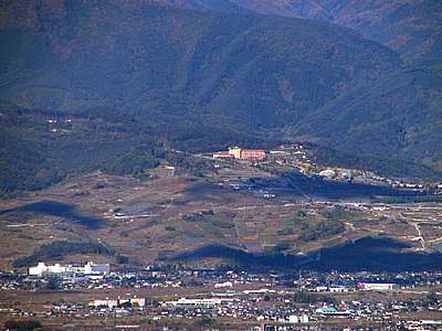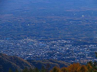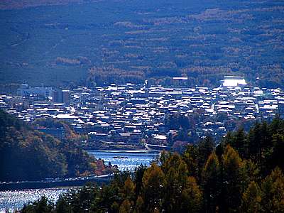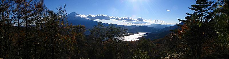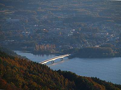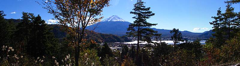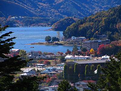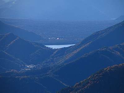 | 午後3時10分 さて終点を左へ進むと三つ峠登山口方向で、右に曲がれば新倉方向となる。 新倉方向へ進めば至る所で河口湖を見下ろせる。またその西方には西湖があり、更にその先には青木ヶ原の樹海を通して本栖湖(写真右の右上)も薄っすらと見て取れる。 |