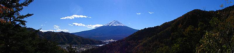 午後1時50分 ここから暫くは各所で素晴らしい景色を見ながら進んで行く。 足下の河口湖はもちろんのこと、遠くには富士吉田市や西湖方面まで広がり非常に爽快だ。