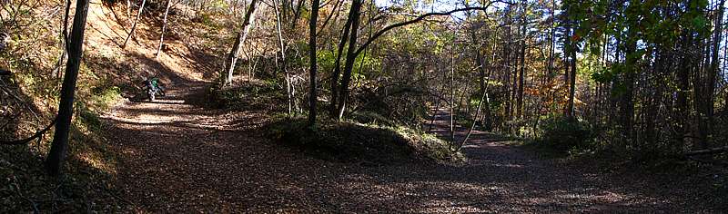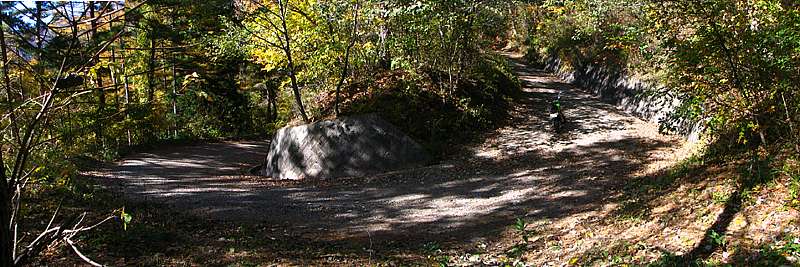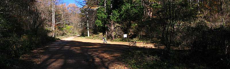 | 午後1時16分 ひとつめの分岐点。 右の道は100mほど上ったところで行き止まり。 本線は左へと進んで行く。 |