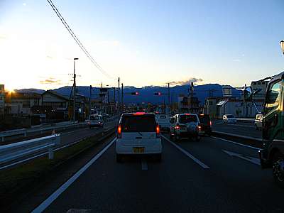 | 午後4時25分 国道20号で再び甲府へ。 石和へ入ったあたりでちょうど日没。 で、実はこのとき真後ろにパトカーが居て、なんとも走りにくかったりする。 |