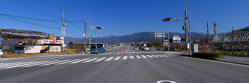 | 午前11時46分 国道20号の「石」交差点。 京戸岩崎山林道はここを右折して南へと進んで行く。 ちなみにこの直ぐ先は中央自動車道の勝沼インターチェンジ。 逆側から来る場合は、勝沼インターチェンジから数分も注意を払ってくれば見逃すことはないだろう。