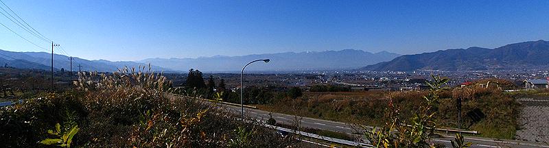 午前11時57分 京戸岩崎山林道への入り口。 ここは釈迦堂博物館の約300mほど西側にあたる。 左手には中央自動車道が沿っており、西側には甲府盆地の景色が広がる。 広々としていてとても気持ちの良い場所だ。