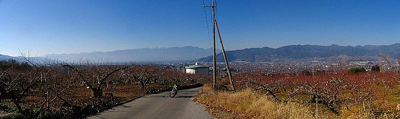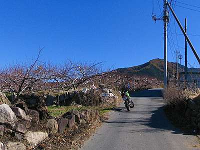 | 午後12時00分 京戸岩崎山林道の起点へ。 一宮町は桃・ぶどうの収穫量日本一を誇る果樹生産地帯だ。 周囲には広大な果樹畑が広がっており、春になると桃の花に染まったピンク色の絨毯が一面を覆っている。 ただ春はモヤることが多いので、来るなら午前中の早い時間の方がいいだろう。