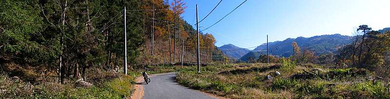 | 2007年11月23日。 ここ何日か素晴らしい青空が続いている。 当日も朝からの快晴。 久しぶりに京戸岩崎山林道へ行ってみることにした。 午前11時10分。 県道6号を東進して北中学校入口交差点。 3連休の初日ということもあり、道はいつもより混んでいる。 |