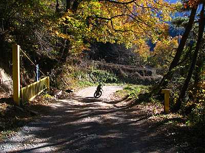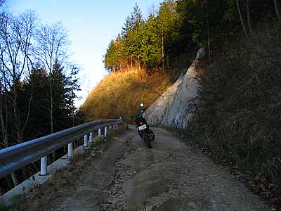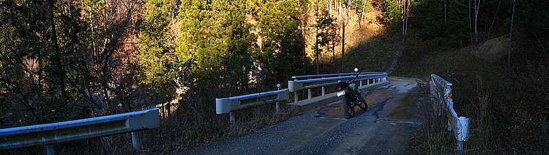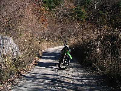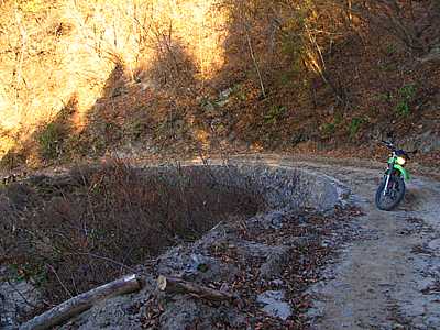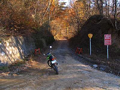 | 2007年11月25日 午後2時39分 さて再び作業小屋へとやってきた。 辺りはシンと静まりかえっており、流石に誰もいないようである。 とはいえ希にだが日曜でも工事をやっていることがある。なので通常なら先を窺いつつ慎重に進んで行くのだが、運が良かったのはこの手前で偶然にもDTさんと出会ったことだ。 DTさんとは何度も走っており互いに顔なじみの仲である。 既に終点まで行ってきたDTさんから「誰もいないよ」と聞けたのは非常にラッキーなことだった。 |