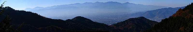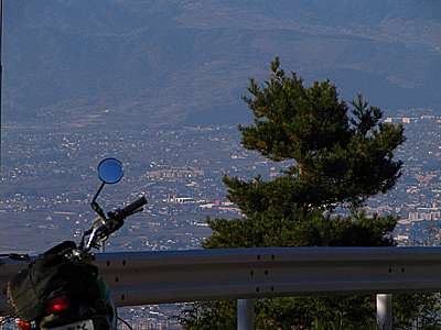 | 午後1時33分 標高が上がるにつれ盆地の景色が顔を覗かせる。 甲府市を中心に、石和町、韮崎市、南アルプス市といった景色が見て取れる。 |