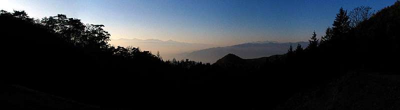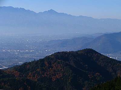 | 午後3時51分 写真では完全な逆光となってしまったが、標高が上がるつれて西側の眺望も開けだしてくる。 見える景色としては春日居町方向で、兜山913mや大蔵経寺山715.6mを通して韮崎市も僅かに顔を覗かせる。 |