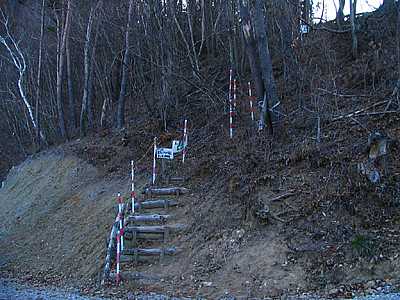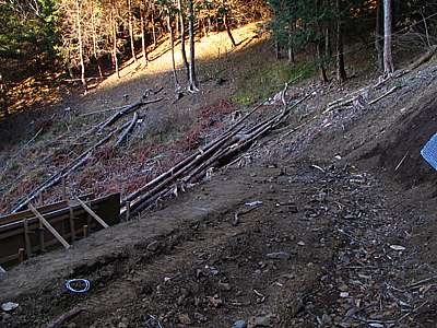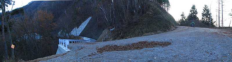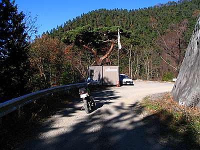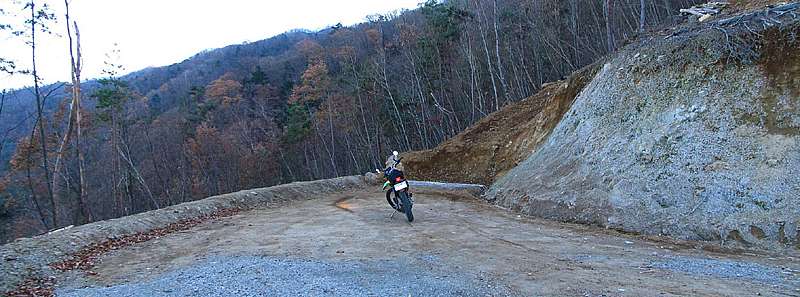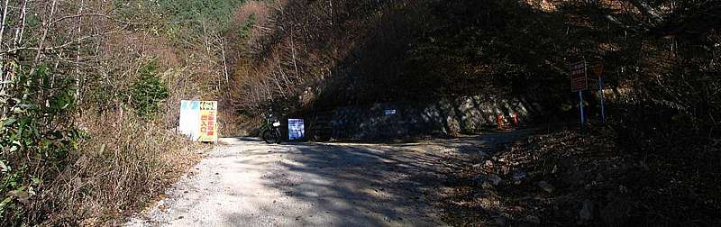 | 午後3時10分 開設現場の近くまでやってきた。 終点間際には道幅いっぱいにブルドーザーが停められており、これ以上バイクで進むのは難しそうだ。 ということで、ここからは徒歩で行ってることにした。 |