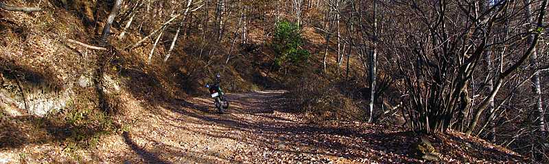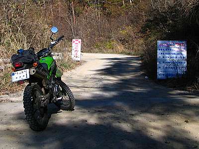 | 午後3時35分 さて最後は京戸山林道へ入ってみることにした。 実はこの林道、ゲートはないものの入り口には「作業用の林道につき一般車両通行禁止」の看板が出ている。 こういう看板が出ているとちょっと入りにくいのだが、ちょっとだけ探索させてもらうことにした(汗)。 |