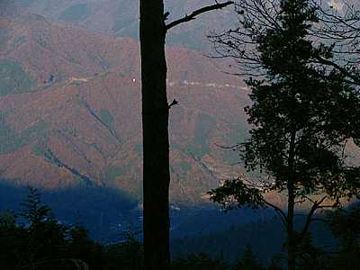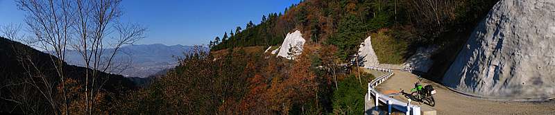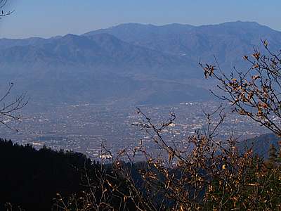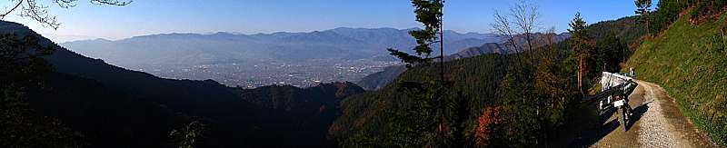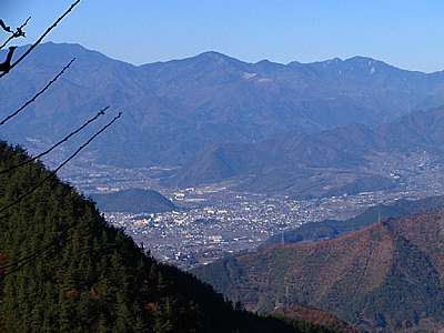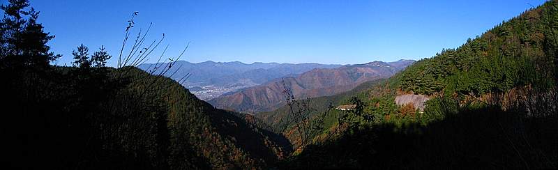 | 午後3時56分 山を廻り込むと大和村や大月市方向の景色が広がってくる。 対面の山に縫う道は何処だろう。 余りハッキリとしないが、或いは笹子峠へ上っていく国道20号なのかもしれない。 |