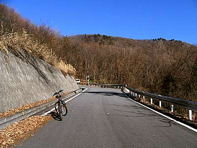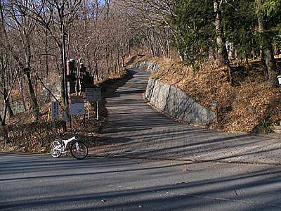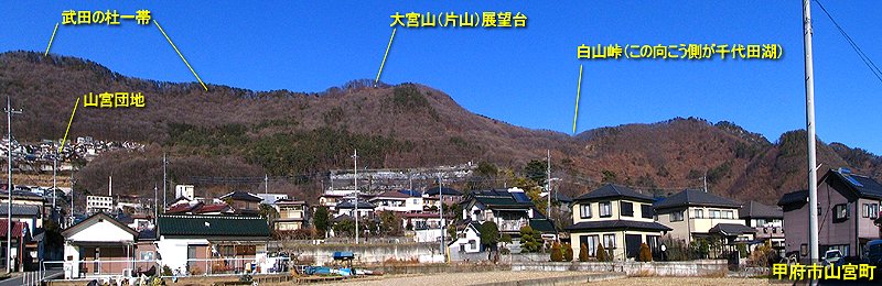 | 朝から気持ちの良い青空となった2008年1月17日。 久しぶりに山宮町の「武田の杜」へと行ってみることにした。 甲府市中心部から武田の杜へ行くには、大きく分けて和田町側と山宮町側から上る方法がある。一般的には和田町側から上る人が多いと思うが、今回は自転車なので、より交通量の少ない山宮町側から上ることにした。 午後2時34分 山宮町は甲府駅から直線距離で北西へ約4キロの場所に位置し、周囲には田園風景の広がる静かな住宅地だ。 山宮町側からは山宮団地から続く片山林道から上っていく方法もあるが、今回は千代田霊園入り口から白山峠へと上っていく。