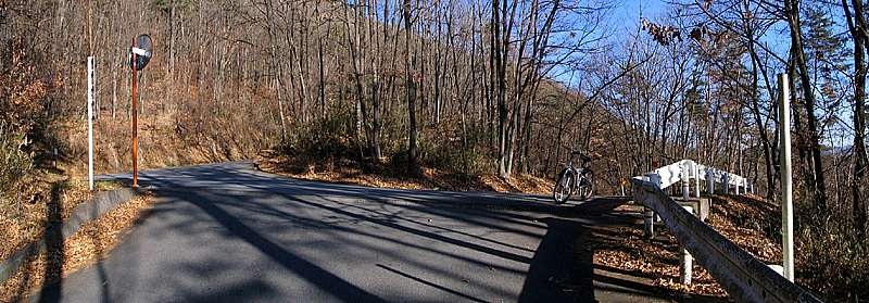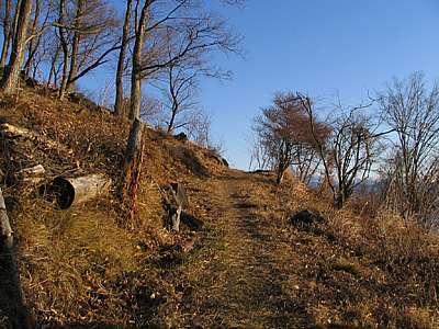 | 午後3時00分 南側に広がる甲府盆地を見つつ片山林道へ到着。 片山林道は2キロ強の短い林道で全線舗装。 山宮団地の東側から上ってきた道がここに繋がっている。 上って来るには団地内の迷路のような道を廻る必要があり、下るのは簡単だが上って来るのは難しいという林道だ。 |