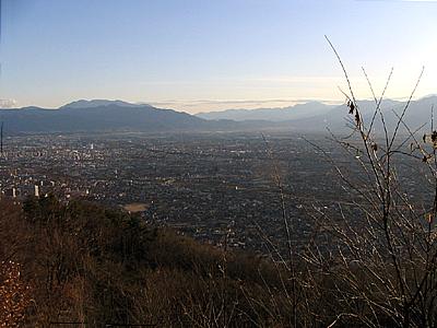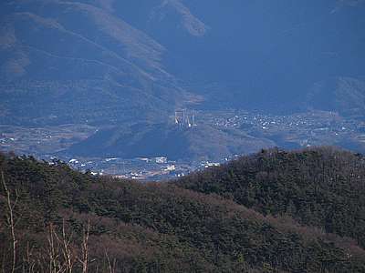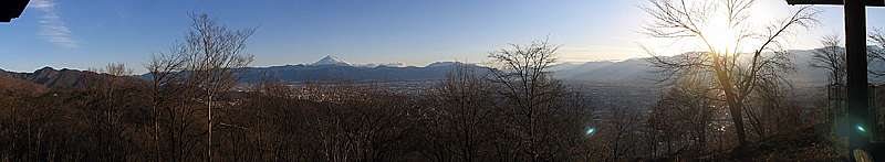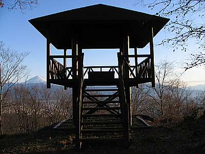 午後4時15分 山頂の南東側には盆地からも見える大宮山の展望台が建っている。 展望台に上れば富士山を始め、盆地や南アルプスの山々まで一望だ。