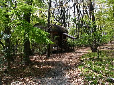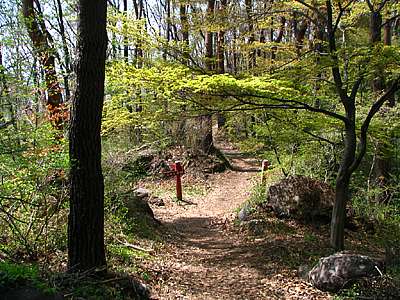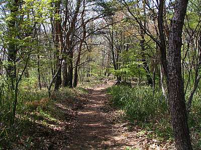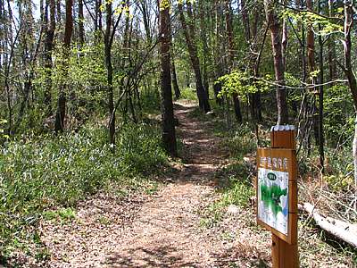 | 2005年4月19日 遊歩道にはそれぞれに、春の道、夏の道、秋の道、冬の道、どんぐりの道、しらかばの道、その他もろもろの名前が付けられており、その延長は約20キロにも及ぶ。 ただ31ヶ所にそれぞれの位置を示す案内板が設けられているので道に迷うようなことはない。 |