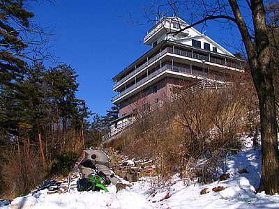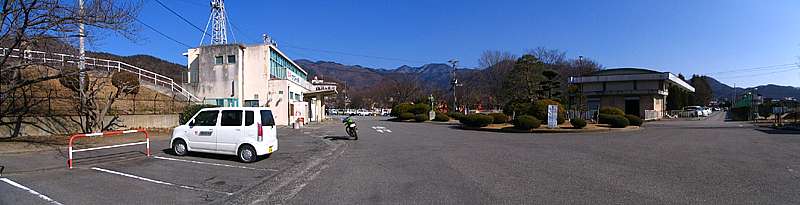 | 午後12時16分 大正池から道なりに200mほど進むと金子峠です。 これ以東に車道はなく、車輌で行けるのはここまでです。 背後には神幽現救世真光文明教団という宗教団体の弥勒館が建っています。館内には絵画、陶芸、鍛金、写真などが展示してあり入場料は無料だそうです。 以前は何もない静かな峠でしたが、現在はこの弥勒館を含め2つの建物が建っており、特にこの弥勒館は相川地区(武田神社周辺)からもよく見えるので目立つ存在です。 |