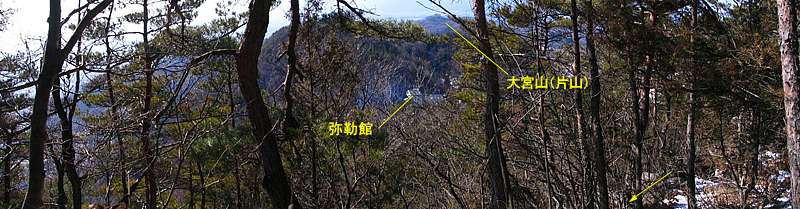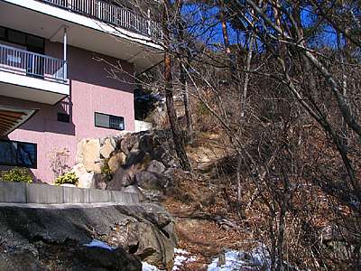 午後12時19分 金子峠から約100m。 弥勒館の東側を掠めるようにして登ります。 左手に視線を送ると正面玄関口で、登るにつれ弥勒館の背後へと廻っていきます。 |