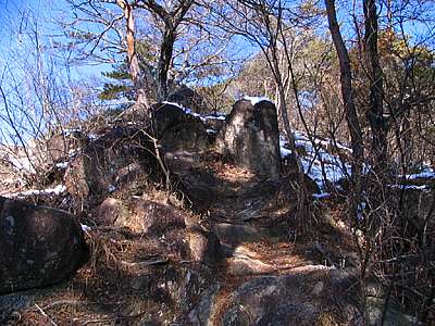 | 午後12時21分 登山道の勾配は大きめで、場所によっては岩場を乗り越えるようにして進みます。 ただ手を使ってよじ登るような大岩ではないので難しいようなことはありません。 |
