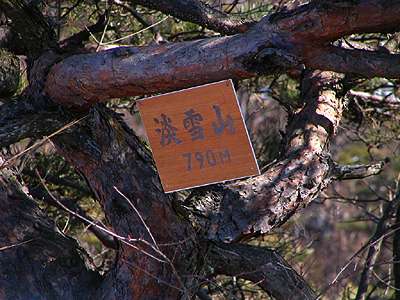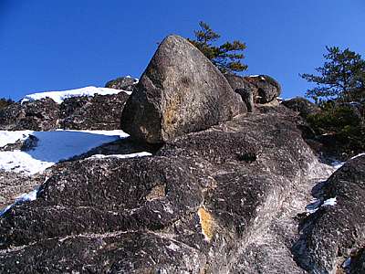 | 午後12時40分 なんとか淡雪山790mへ到着(本当に790m?)。 この両側の切れ落ちた道は僅か数10m程度ですが、一歩ごとに足場を確認しながら進んだため5分も掛かってしまいました。 ちなみに名前の由来は「白砂で雪をまとったように見える」ということから名付けられたようですが、山というより尾根の途中にある単なる花崗岩の道、といったような場所で、看板がなければ山と気がつかずに通り過ぎてしまうことでしょう。 なお当日はここまで22分も要してしまいましたが、普通なら5分から10分で登れてしまうと思います。 |