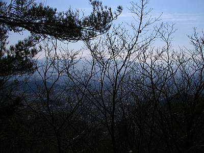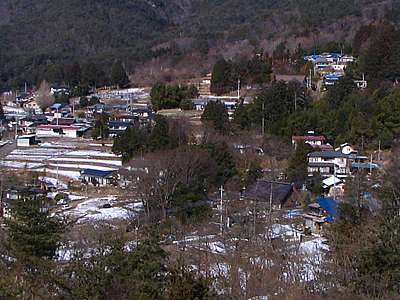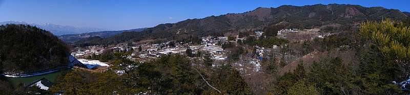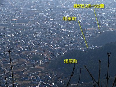 | 午後12時30分 一方の北側は上帯那地区の景色です。 その上部に延びるのは阿梨山1102.4mからの稜線で、稜線を越えた先は無人の町となった塔岩町です。 |