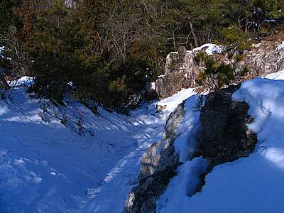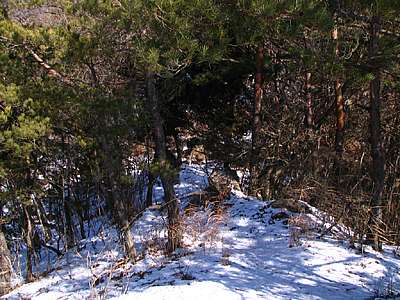 | 午後1時05分 登山初心者なのでアイゼンなど持っているはずもありません。 無理をしないことが信条なので、進むべきか戻るべきか、を考えるまでもなく引き返すことを即決です。 ただ天気は快晴。このまま終えてしまうのも惜しいので、少々変則的にはなるものの逆のツク坂峠(穴口峠)側から歩いてみることにしました。 |