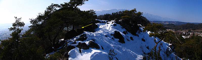 午後12時35分 さて景色を眺めたあとは淡雪山へと進みます。 といってもここは既に山頂といってもいい場所で、前方に視線を送ると淡雪山の山頂を示す看板が見えています。 ただここからの道は馬の背です。 歩き幅は50センチから1m。普段なら問題ないのですが、あいにく当日は一昨日に降った雪で10センチほどの積雪。何ヶ所かでは岩場を乗り越えていく場面もあり、下手に足を滑らせるとそのまま滑落しそうです。 ということでここだけは極めて慎重に進みます。
