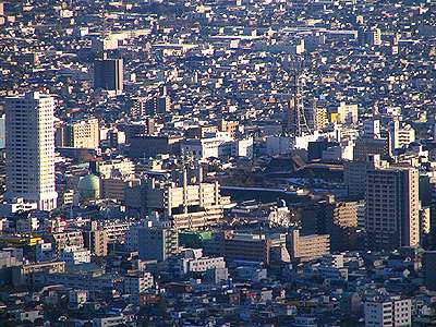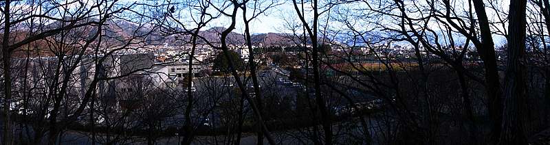 | 午後3時24分 甲府北部の町並みを見ながら進む。 が、道は階段状になった九十九折れ。 何度も切り返しながら登っていくのでなかなか先へと進まない。 |