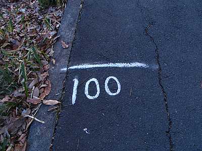 午後2時57分 暫くは緑が丘スポーツ公園を見ながら登っていく。 しかしいつからだろう。 路面には100m単位で距離表示が示されるようになっていた。 |
