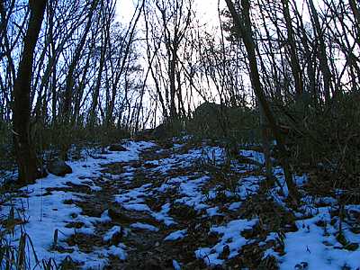 午後4時03分 空き地からは再びの上り坂。 暫くは前方の堂ノ山を見ながら登っていく。 ちなみに気温は5度前後といったところだろうか。 歩いているので寒さは全く感じないないのだが、吹き抜ける風は唸りをあげるほどに強く、耳当てを持参しなかったことを後悔させられた。 |