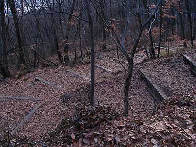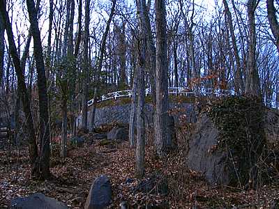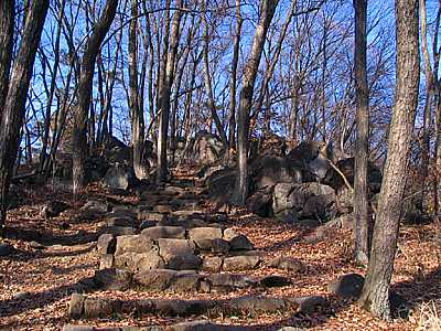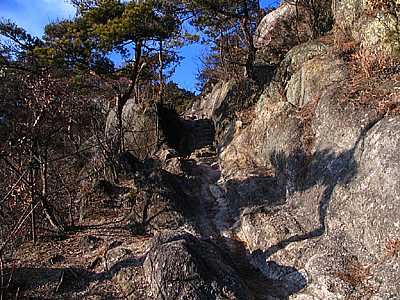 | 午後4時12分 花崗岩の岩を削って造られた階段道。 堂ノ山までは100段くらい?の階段道となっているが、いったい誰がいつ造ったのだろうか(甲府市か?)。 |