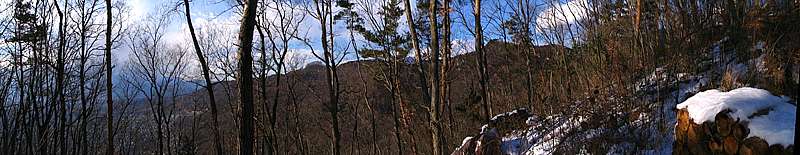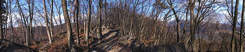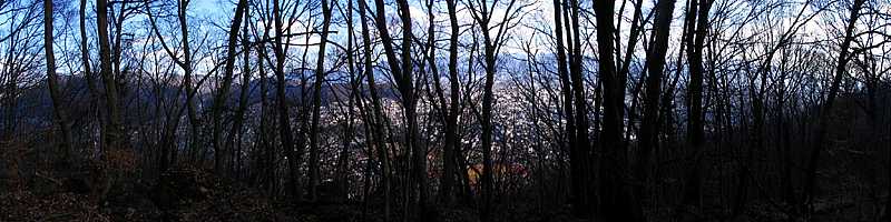 午後4時24分 遊歩道の最高所となる堂ノ山638.4mへ到着。 県営体育館の標高が295m前後なので、ここまで約340m前後を登ってきたことになる。 なお山頂には八王子神社が建っており、不遜ながら岩を登って祠の横に立つことも出来る。 が、眺望は周囲の木々に阻まれるためいまひとつだ。 |