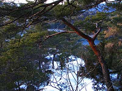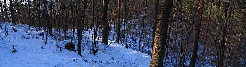 | 午後4時26分 八王子神社をそのまま越えていくこともできるが、右側を廻っても裏へと抜けられる。 八王子神社の裏へ回れば千代田湖は目の前だ。 ここから千代田湖までは10分ほどの距離。 予定では千代田湖まで行くつもりだったが既に日暮れ間近。 何10回と来ているので道を間違えることはないが、日が暮れてからの雪道は厄介だ。 ということで当日はここで引き返すことにした。 |