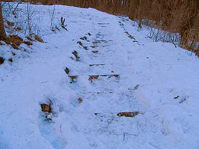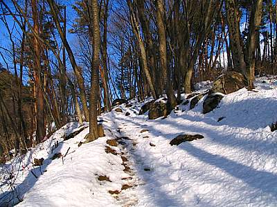 | 午後3時44分 雪のあとも多くの人が登っているようだ。 踏み固められているので歩く分には気にならないが、階段道はうっかりすると滑るので慎重に下っていく。 |