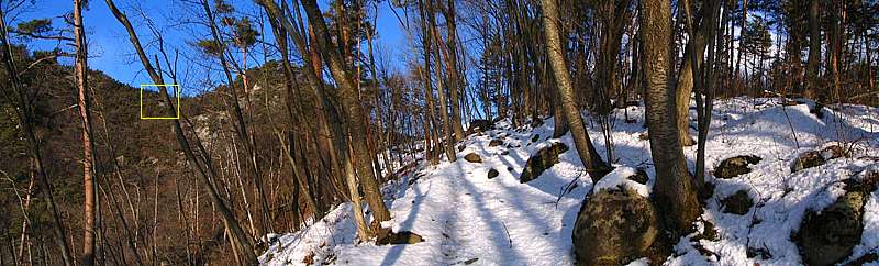 午後3時07分 実はこの舗装路は1200m地点まで続いている。 時間にすると約20分ほどの距離だが、舗装路を歩くのも少々飽きてきた。 ということで500m地点からは直登ルートに切り替える。 |