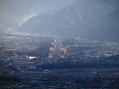 | 午後4時15分 先に見た旧八田村の御勅使川と御勅使南公園。 雲でやや陽が陰ってしまったが、空気が澄んでいるので遙か先まで見通せた。