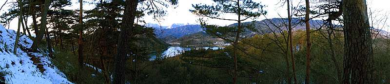 | 午後3時40分 ちょうど中間点までやってきた。 正面稜線の一番高い山が堂ノ山638.4m。 いまからその山頂を越えて千代田湖へと向かっていく。 |