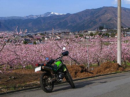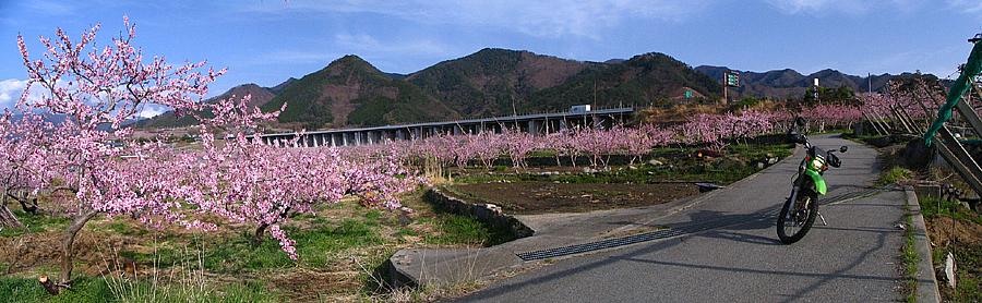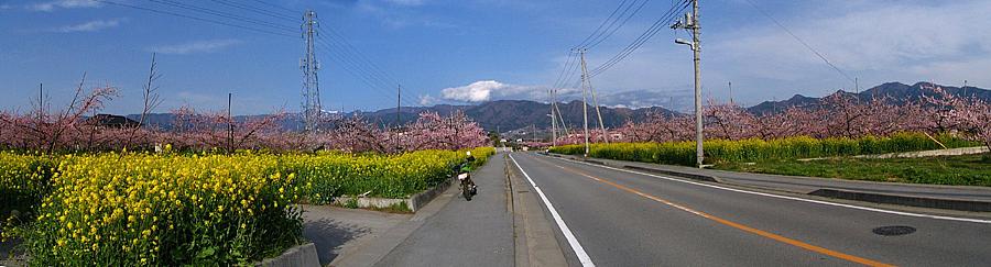 | 山梨市の正徳寺あたり。 桃の花と菜の花が綺麗だったのでUターンして撮影。 ちなみに山梨市方向の西へと向かっているのだが、Uターンしたのでバイクは逆向き。