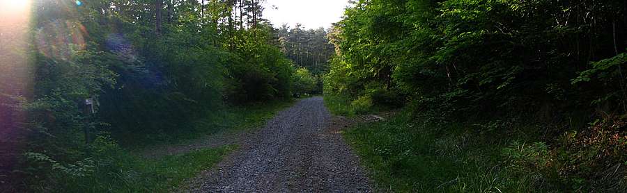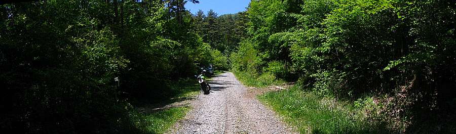 | 午後12時41分 前山大明神林道からの登り口。 同地点は十字路になっており、左からの道が深田記念公園から上ってくる道になっている。 標高は1060m前後だろうか。 ショートカットする距離は約1キロで、時間的には20分くらいは短縮できそうだ。 ちなみに車は30mほど先に数台分、更に300mほど進むと10台分くらいのスペースが設けられている。 当日は1台の車が停まっているだけだったので、よほどの混雑期でなければ駐車できると思われる。 |