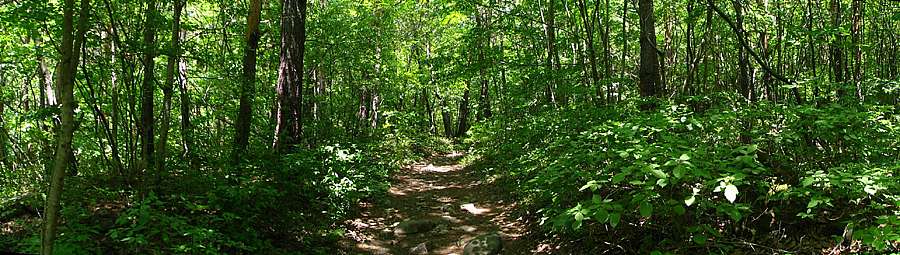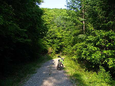 | 午後12時50分 鬱蒼とした樹林帯の中に続く道。 景色はないが、森林浴たっぷりで極めて爽快だ。 |