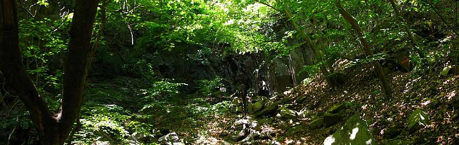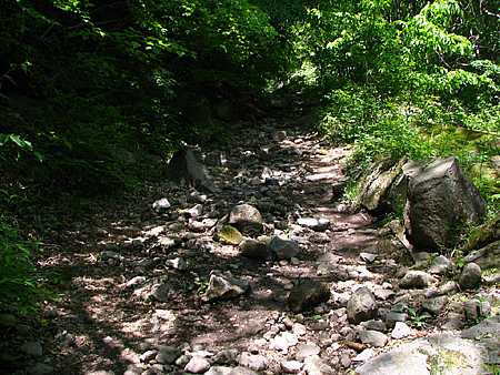 午後13時15分 この辺りからは急登。 急傾斜の道には大きな岩がゴロゴロと転がっている。 既に息ゼーゼー。 一瞬、引き返そうか、とも考える。 |