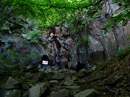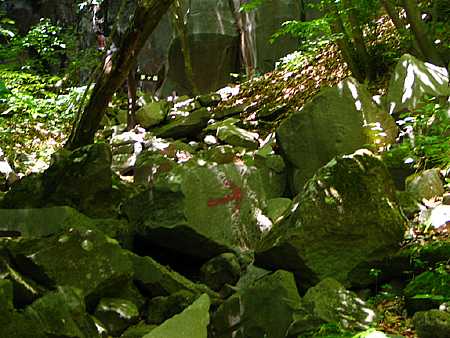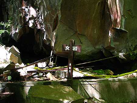 | 午後13時19分 高さは20mくらいだろうか。 正面は花崗岩で出来たどん詰まりの岩壁だ。 岩壁の前には「女岩」と書かれた標識が立っている。 |