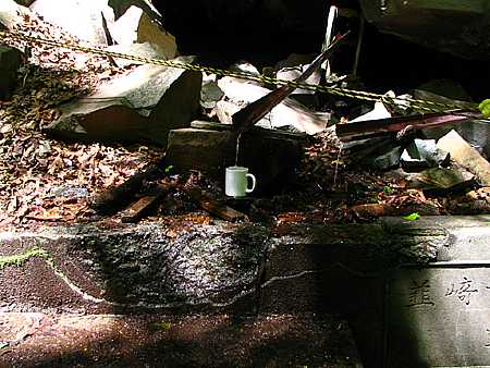 午後13時19分 岩壁からはちょろちょろとした湧き水が流れており、その下には親切にもコーヒーカップが置かれていた。 |