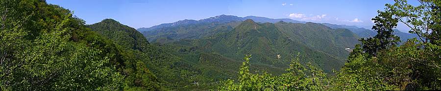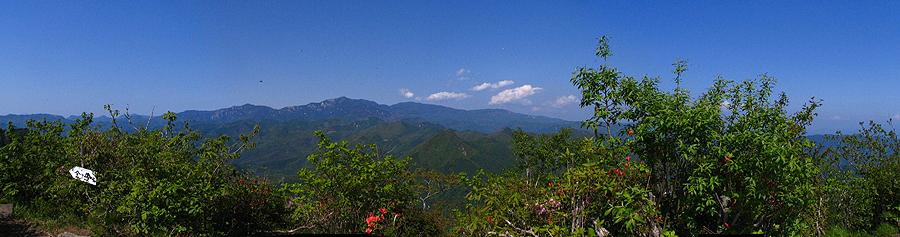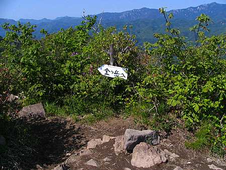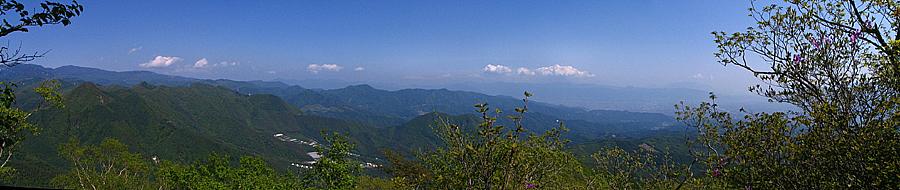 | 午後14時55分 こちらは北西から北東にかけての景色。 金峰山を中心に瑞垣山、国師ヶ岳、乾徳山といった名だたる山々が連なっている。 眼下に見おろすのは観音峠の近くに建つ無線中継所。 観音峠側からも茅ヶ岳や金ヶ岳への登山道が上っており、観音峠大野山線沿いには案内板も立っている。 |