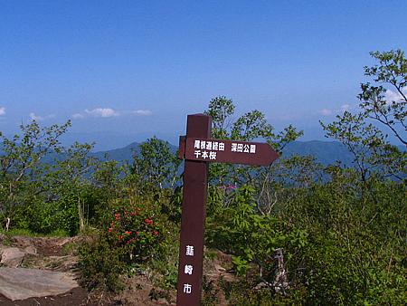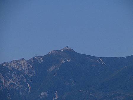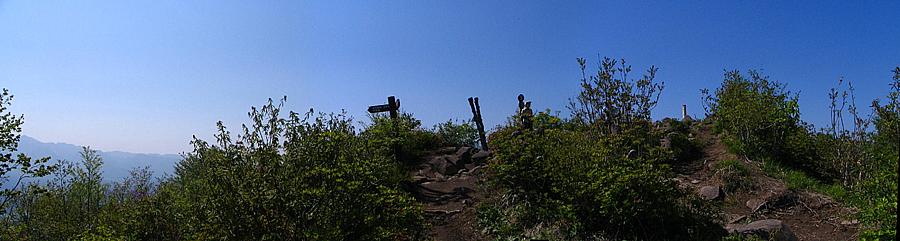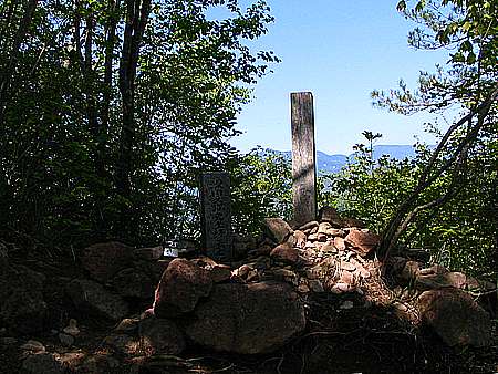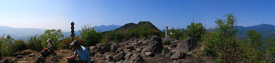 午後14時29分 ん?着いた? 登り始めて1時間44分で山頂へ到着。 が、なんだか感動が薄い.......なんでだろう。 広さは10m四方くらいだろうか。 切り開かれた山頂に大きな木は1本もない。 このため360度の景色を見渡せるが、夏は日影がないので暑そうだ。 山頂には既にお二人の方が陣取られていた。 挨拶をしたが返事がなかったので、その後に言葉を交わすことはなかった。 |