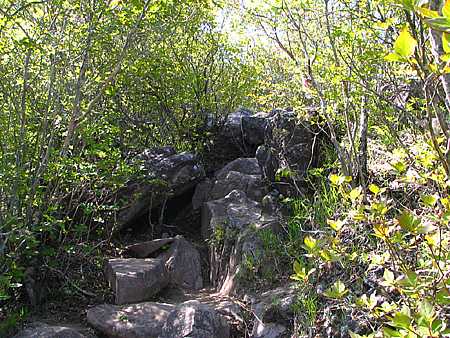 | 午後13時00分 道横のケルン。 こういった積み石はこの先でも至る所で目にすることになる。 先に登った登山者が後者の為に建てたものだそうで、賽の河原の積み石とは意味合いが違うそうだ。 |