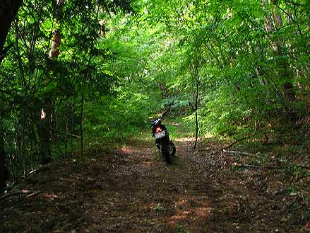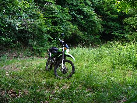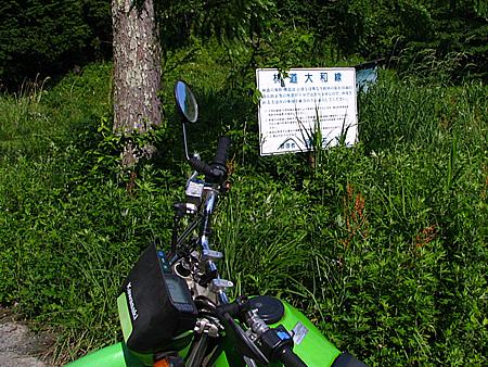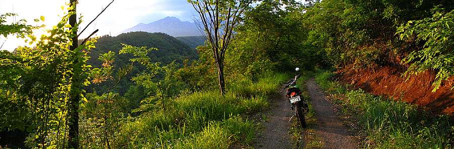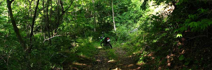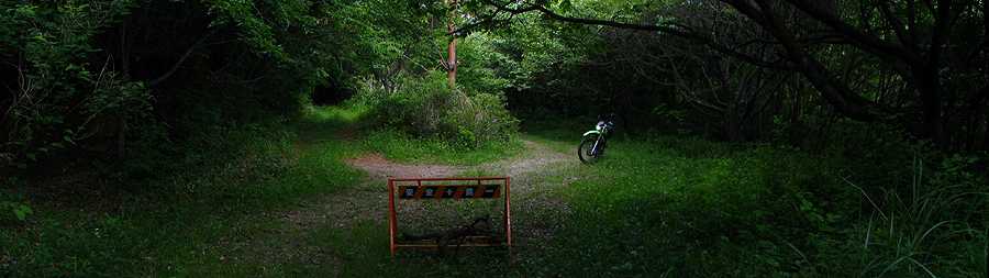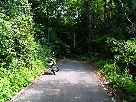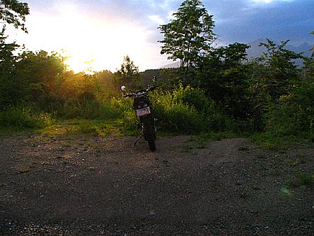 | 午後4時59分 終点へ到着。 終点は20m四方の空き地になっている。 木々に囲まれているので景色的には乏しいが、北西側に立つと八ヶ岳や国道141号を僅かに望める。 なおバイクはここまでだか、空き地の先端から約5分ほど歩くと3層の見晴らし台が建っている。 |