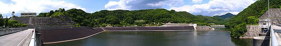 | 午後2時17分 大門ダムへ到着。 大門ダムは大門川を堰き止めて造ったダムだそうだ。 ダムの堤高は65.5mで堤長は180m。 1968年に着手して1987年に竣工した多目的ダムであるという。 遮水には様々な工夫がなされ、その技術に対しては土木学会技術賞が贈られたそうだ。 ダムの南側は小さな公園となっており、ここには各種の案内板や技術賞の石碑、それに標高906.6mという杭が立っている。